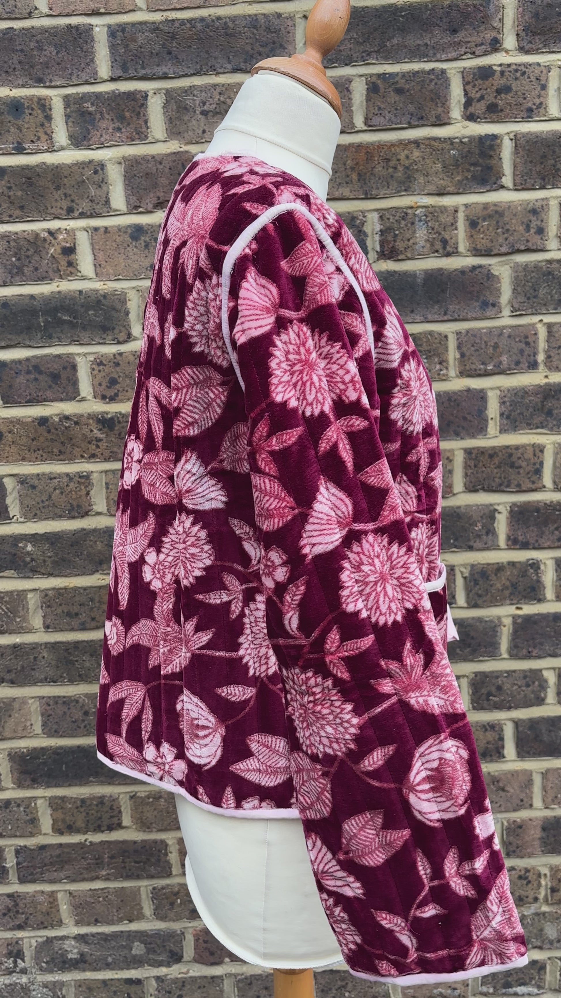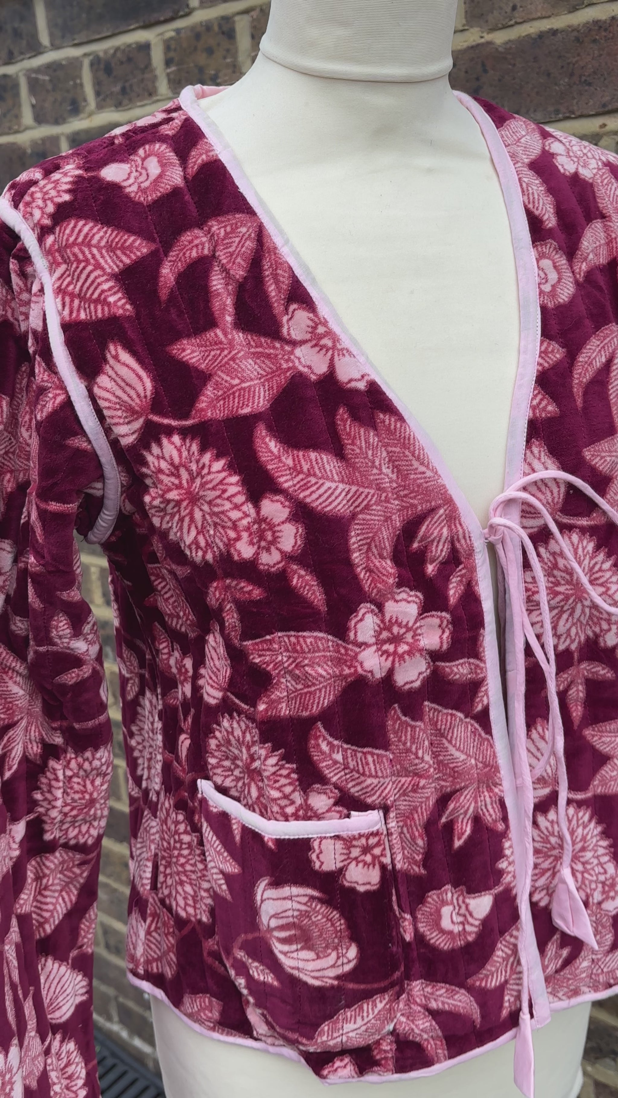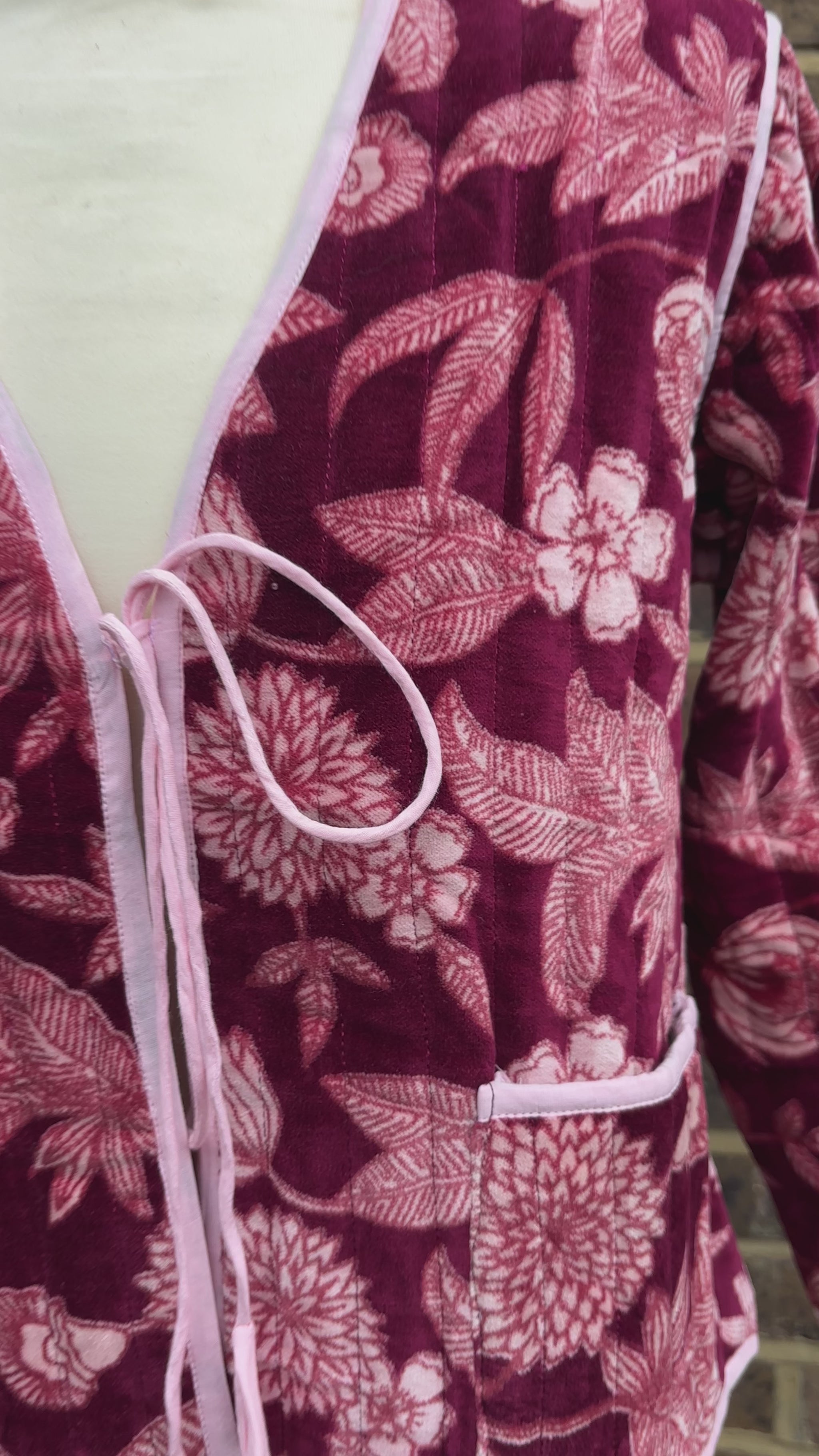 A burgundy jacket with a pink lining and tie front bow. Perfect for Christmas Day wear.